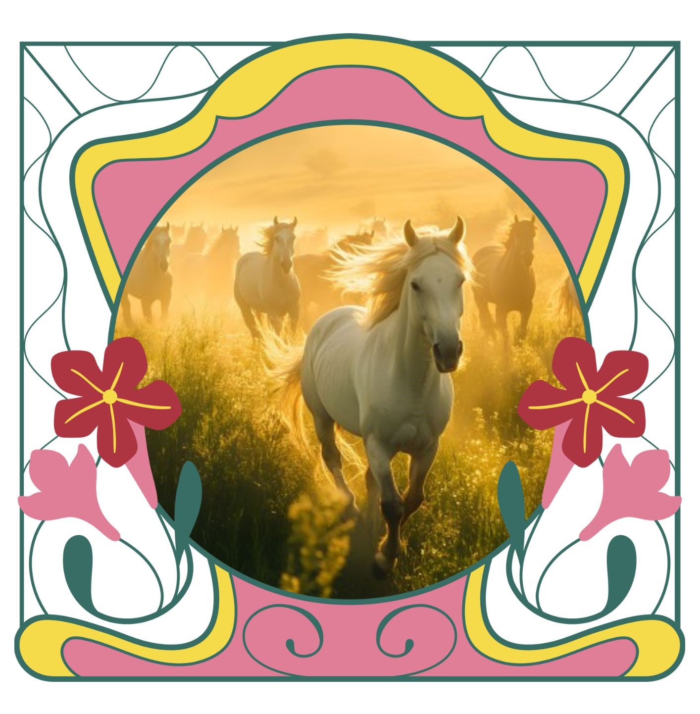Trommelnde Hufe wirbeln durch die Landschaft. Im goldenen Licht der Sonne galoppiert eine Herde von Pferden mit wehenden Mähnen...